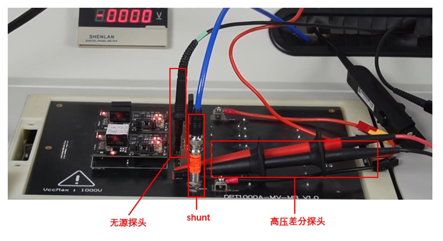 端电压测量选用高压差分探头,在满足宽电压测量范围的同时具有更大的输入阻抗,提供了安全的测试保障。端电流测试选用shunt电阻,其带宽达到1GHz以上,能够满足高速器件对带宽的要求。