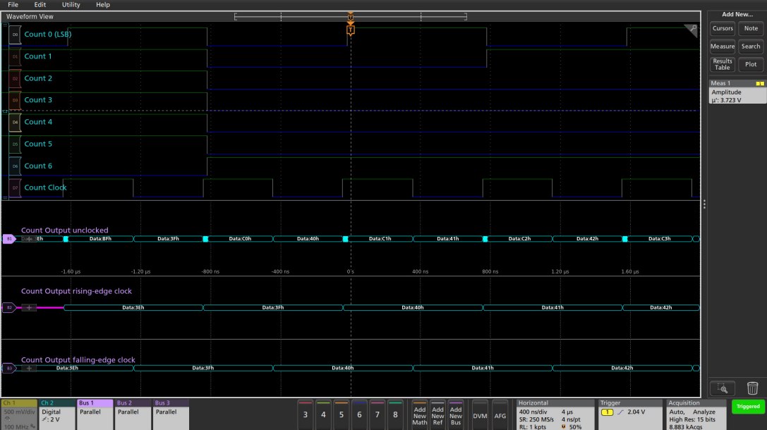 图1.在MDO/MSO系列上的定时采集示例。定义了三条并行总线,并利用器件的时钟信号对其进行解码。