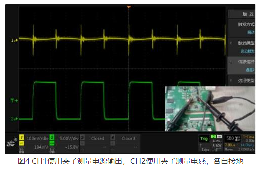 3.通道1和2探头地使用鳄鱼夹分别接地(串扰严重,见图4);