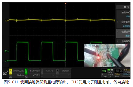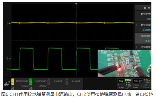 5.通道1和2探头均使用弹簧分别接地(串扰小,见图6);