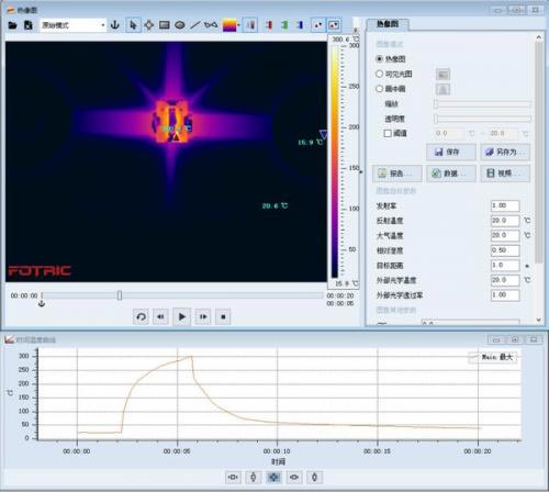 Fotric288热像仪支持全辐射热像视频流(Full radiometric thermal video),可以记录电路板整体的温度升高与扩散过程,例如记录瞬间短路和电路击穿等情况。视频可二次任意分析,提供趋势图、三维图、数值矩阵等多种工具,有助于PCB设计优化。