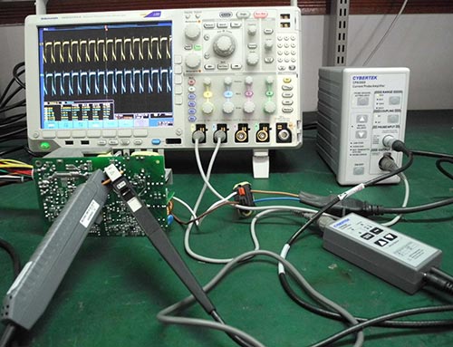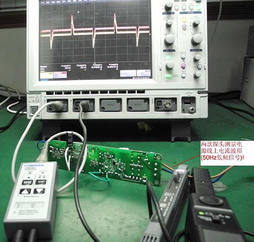 开关电源的开关频率可以达到 100KHZ,当然还有更高的,瞬间的上升速度达到 NS 级别,如果使用低频电流嵌(US 级别,如本公司的 CP8100L,泰克的 A622),根本无法准确捕捉波形,必须使用高频直交流电流探头。下面以本公司 250W 的 ATX 不间断正激电源模块为例,测试系统如图,本公司的 CP8030A(40MHZ/30A)和泰克的 TCP0030(120MHZ/30A)