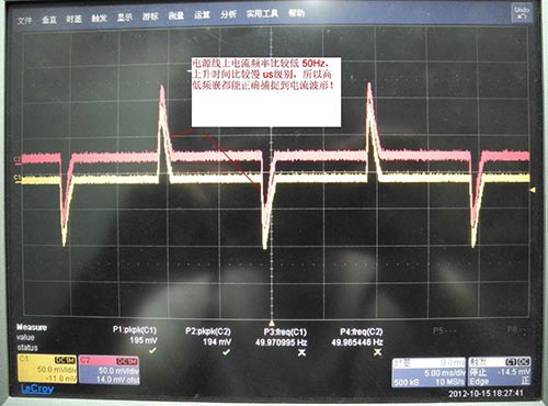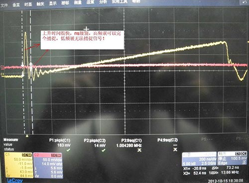 在捕捉 60KHZ 左右的开关电流波形时,从图 10 看到,电流波形的上升时间达到 35NS 左右,普通的低频嵌 CP8100L,带宽 100KHZ,上升时间 3.5US,远远无法满足要求;高频电流嵌CP8030A,带宽 40MHZ,上升时间 8.75NS,满足实际测量要求。