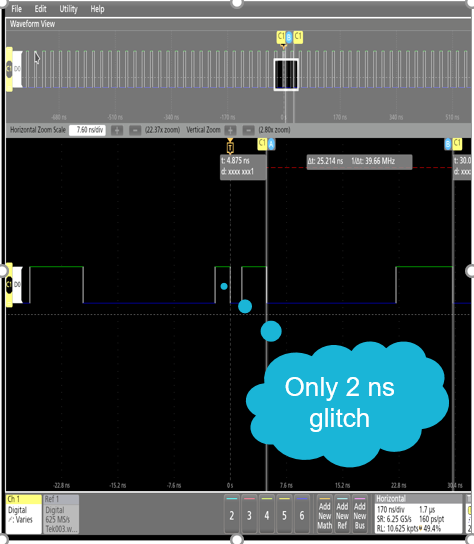 图7可以看到一个40MHz的数字信号,其中一个非常小的干扰信号会导致有2nS的快速脉冲,数字采样率直接导致设定触发条件的极限,如果是500MS/s最快的脉冲触发只能设定在4ns,但是泰克新一代示波器MSO4/5数字信号的时间分辨率提高了12倍,轻松准确的捕获更快的数字信号信息。